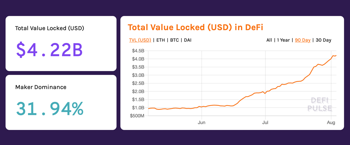 تشير الإحصاءات إلى أن اقتصاد التمويل اللامركزي (defi) قد نما بشكل كبير هذا العام حيث تجاوزت القيمة الإجمالية المقفلة (TVL) في defi مؤخرًا 4 مليارات دولار. بين منصات dex ، والمشتقات ، والعملات المستقرة ، والإقراض ، وإنشاء الأصول غير القابلة للاستبدال ، دفع الربع الثاني من عام 2020 شبكة Ethereum إلى آفاق جديدة.