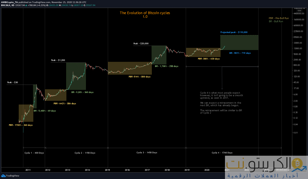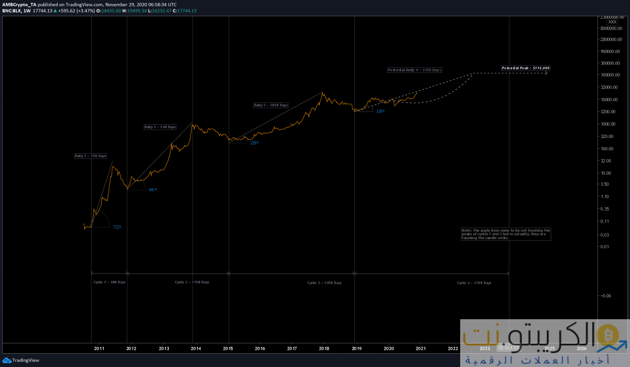 يُظهر الرسم البياني أعلاه أن عملة البيتكوين قد شهدت 3 دورات حتى الآن ، مع انتهاء الدورة الثالثة في ديسمبر 2018 عندما وصل سعر البيتكوين إلى قاع عند 3،122 دولارًا. يقال إن الطول المتوقع للدورة الرابعة يبلغ حوالي 1760 يومًا ، مع الأخذ في الاعتبار 760 يومًا المنقضية ، ولا يزال هناك 1000 يوم حتى تنتهي الدورة التالية.