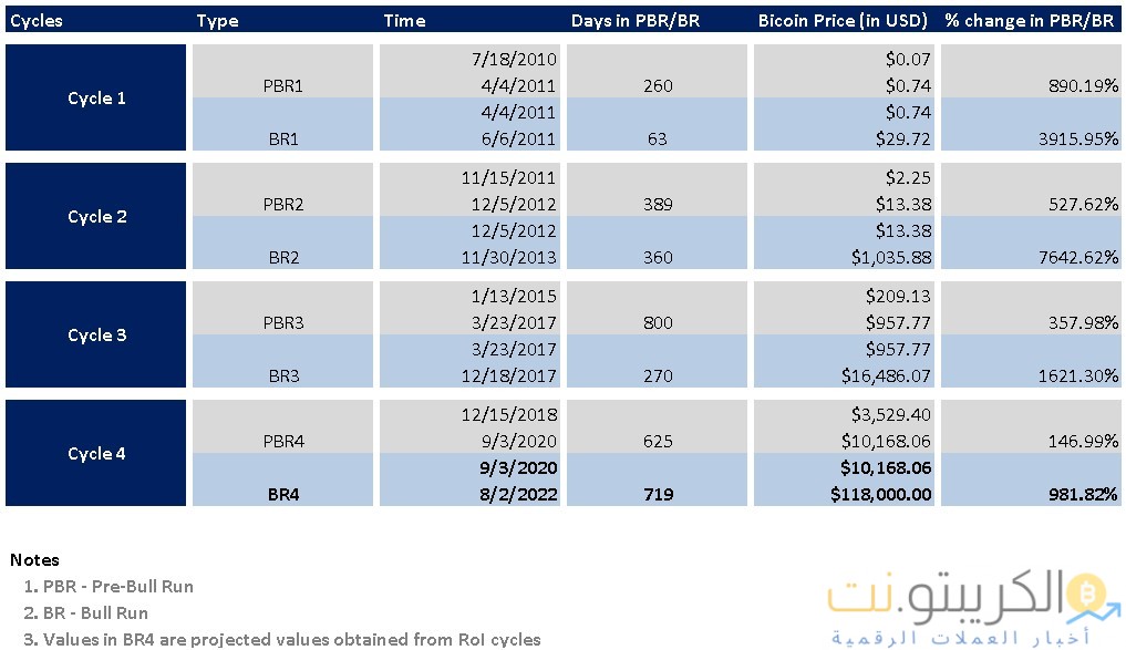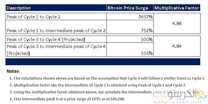 من الجدول أعلاه ، يمكننا أن نتوقع أن ترتفع عملة البيتكوين بنسبة 981٪ من 10000 دولار لتصل إلى 118000 دولار.
