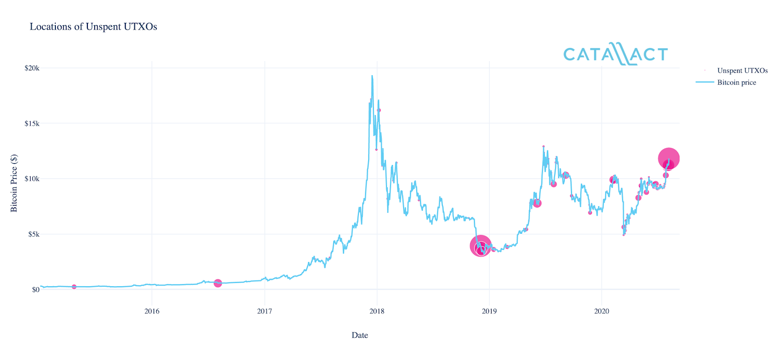 لا تنظر إلى أبعد من مواقع UTXO وتراكماتها حيث يمكن استخدامها لتحديد المراكز الطويلة وأسعار الدخول. وجد التقرير المعني مجموعتين من UTXO – واحدة لشهر ديسمبر 2018 والأخرى في الوقت الحاضر ، يوليو – أغسطس 2020.
