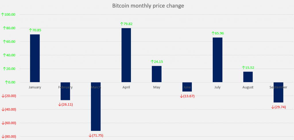 من حيث الأشهر الإيجابية والسلبية ، فإن الفارق عادل. أربعة من الأشهر التسعة كان متوسط الفرق في السلبي – فبراير ومارس ويونيو وسبتمبر ، بينما كان للباقي متوسط فرق في الإيجابية. ما يعنيه هذا هو أنه لمدة أربعة أشهر في العام ، كان متوسط الفرق على أساس يومي سلبيًا ، مما يعني أن الاتجاه العام كان هبوطيًا والعكس صحيح لبقية الأشهر الخمسة.