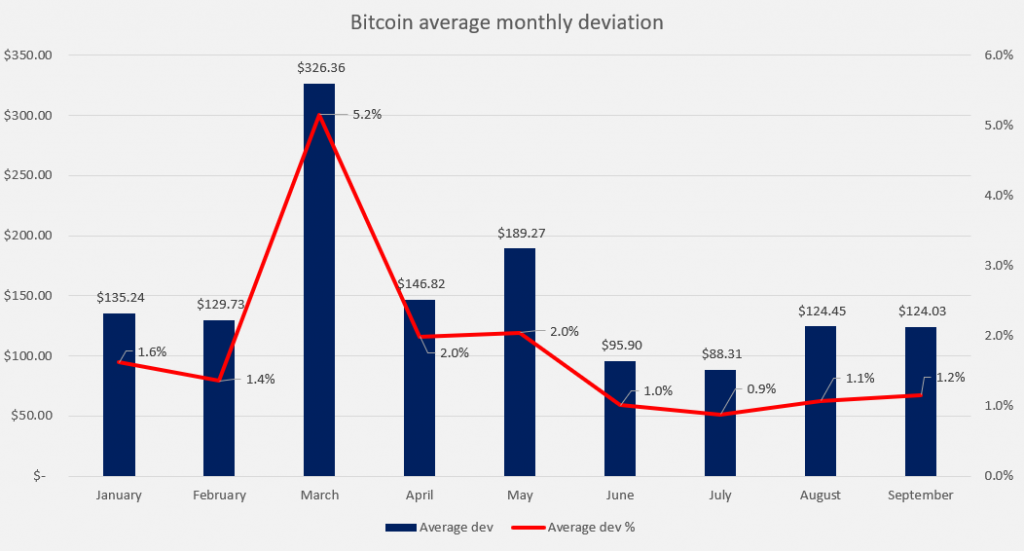 عند تحليل تحركات أسعار البيتكوين من بداية العام وحتى نهاية سبتمبر ، لوحظ أن الشهر الأكثر تقلبًا هو مارس وليس مايو.