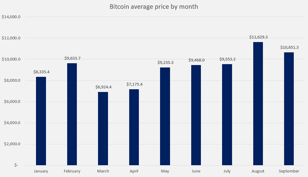 بالنظر إلى متوسط السعر الشهري ، ليس من المستغرب أن يكون لشهر أغسطس الأعلى مع اتجاه ثابت يزيد عن 11000 دولار وكان مارس هو الأدنى. ارتفع المتوسط من مارس إلى أغسطس ، قبل أن يؤدي انهيار سبتمبر إلى ما دون 11000 دولار.