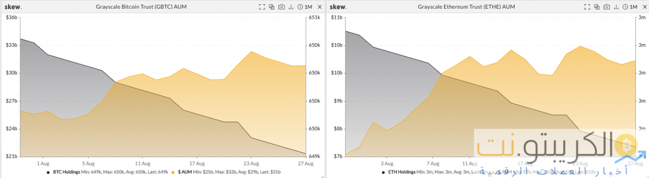 من بين جميع المؤسسات الكبرى ، تواصل صناديق Grayscale الاحتفاظ بحصة الأسد في الأصول المذكورة أعلاه. أشارت بيانات Skew كذلك إلى أن قيمة الأصول المدارة من ETHE قد نمت بوتيرة أسرع بكثير (42.8٪) بالمقارنة مع GBTC (19.2٪) خلال الشهر الماضي.