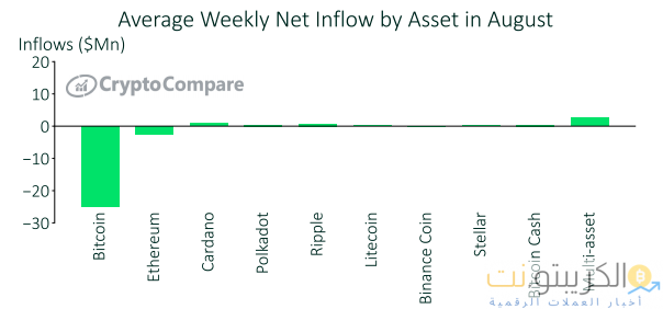 حسنًا ، تأخذ الأحجام في الاعتبار كلا من التدفقات الداخلة والخارجة. ومن ثم ، في هذه المرحلة ، تجدر الإشارة إلى أن منتجات الاستثمار في الأصول الرقمية شهدت صافي تدفقات أسبوعية صافية قدرها 22.5 مليون دولار حتى الأسبوع الثالث من أغسطس. كان نفس الشيء مدفوعًا إلى حد كبير بالتدفقات الخارجة في منتجات البيتكوين والإيثيريوم. ومن المثير للاهتمام ، أنه إلى جانب الأصول المتعددة ، شهدت المنتجات أحادية الأصول التي تتضمن XRP و Cardano (ADA) تدفقات صافية.