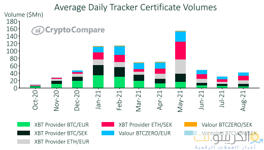 شهدت أحجام المنتجات الإجمالية اليومية أكبر زيادة في شهر واحد منذ مايو (بنسبة 46.6٪). وقادت منتجات Ethereum هذا الارتفاع إلى حد كبير. على سبيل المثال ، شهدت أحجام التداول اليومية لشركة ETHE ارتفاعًا بنسبة 105.9٪ ، بينما ارتفعت أحجام GBTC بنسبة 17.4٪ فقط في نفس الفترة الزمنية. في الواقع ، ذكر تقرير CryptoCompare ،