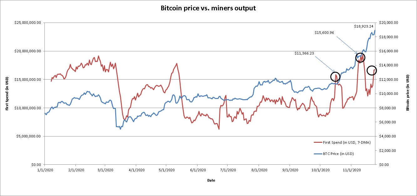 من الرسم البياني ، يمكننا أن نرى أن مخرجات عامل تعدين البيتكوين قد انخفضت بشكل حاد في مناسبتين 16 أكتوبر و 9 نوفمبر ، خلال هذين القطرين ، ارتفع سعر البيتكوين من 11000 دولار إلى 15600 دولار وإلى 18900 دولار. حتى كتابة هذه السطور ، كان هناك عامل تفجير آخر في التشكيل.