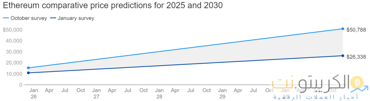 بالإضافة إلى ذلك ، توقعت اللجنة أن يصل سعر Ethereum إلى 10810 دولارات بحلول نهاية عام 2025 و 26338 دولارًا بحلول نهاية عام 2030 على المدى الطويل.