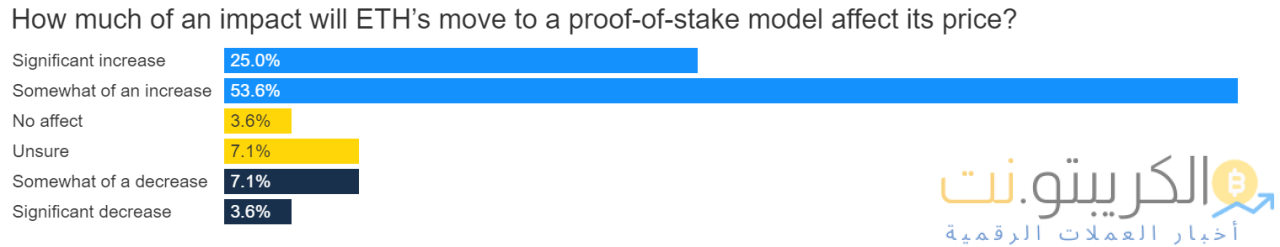 علاوة على ذلك ، شعر 79٪ من أعضاء اللجنة أن انتقال Ethereum إلى نموذج إثبات الحصة (PoS) سيؤدي إلى مكاسب في الأسعار ، بينما يعتقد 11٪ أنها ستؤدي إلى انخفاض الأسعار بسبب استمرار ارتفاع رسوم الغاز وصعوبات التوسع. .
