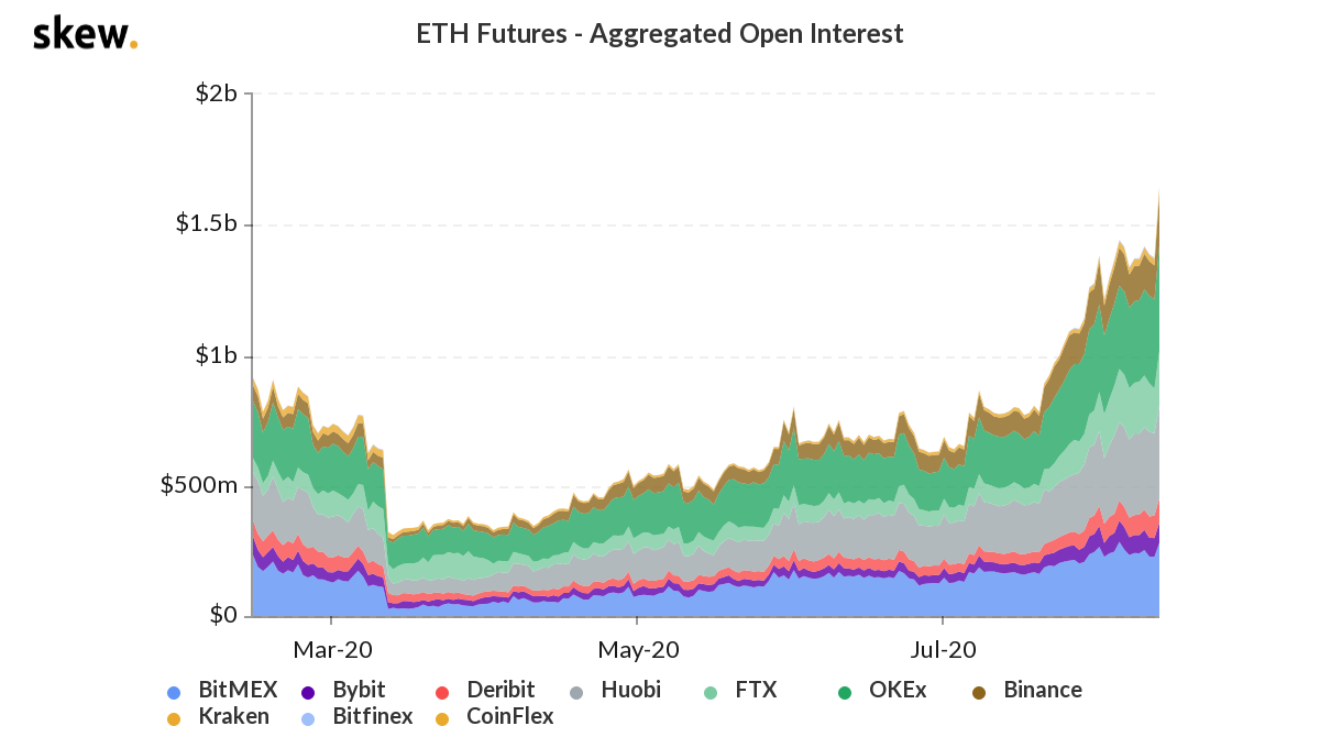 مع ارتفاع السوق الفوري ، كان سوق المشتقات يعكس أيضًا اهتمامًا كبيرًا من المتداولين. وفقًا لمزود البيانات Skew ، مع ارتفاع سعر الإيثر ، تم تصفية صفقات بيع بقيمة 1.3 مليون دولار في اليوم الماضي في BitMEX.
