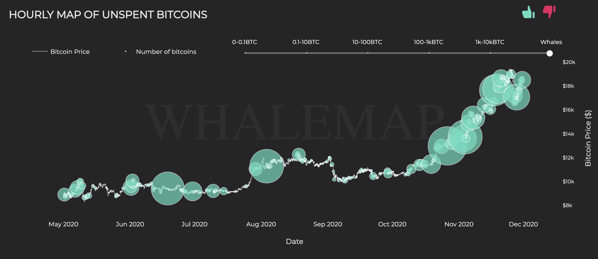 الدافع الرئيسي الآخر لارتفاع الأسعار الحالي هو تراكم الحوت وعملات البيتكوين غير المنفقة. استمرت المؤسسات مثل Grayscale في شراء Bitcoin بشكل منهجي حتى فوق مستوى 18000 دولار ، والآن تناقش وسائل الإعلام الرئيسية كيف تشتري PayPal ، عملاق الدفع ، Bitcoin. الحيتان التي لديها أرصدة تزيد عن 10 آلاف بيتكوين تجولت خلال ارتفاع الأسعار لدفع السعر إلى المستوى الحالي. يوضح الرسم البياني أدناه من Whalemaps عملات البيتكوين غير المنفقة من الـ 24 ساعة الماضية.