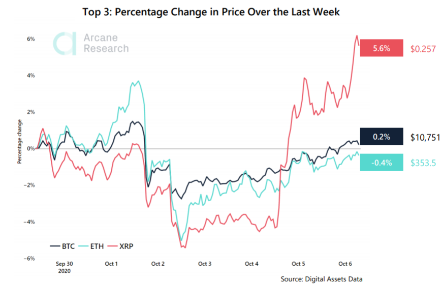 خلال الأسبوع الماضي ، Bitcoin [BTC] بقيت عند الحد الأدنى من الربح بنسبة 0.2 ٪ ، بينما ، Ethereum [ETH] كان يشهد خسارة 0.4٪. ومن المثير للاهتمام ، أن XRP كان يتفوق في الأداء على BTC و ETH حيث أبلغ عن ارتفاع بنسبة 5.6 ٪ في سعره.