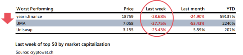 وفقًا لـ Messari ، كانت الرموز المميزة لـ DeFi من بين الأكثر تضررًا ، بما في ذلك YFI ، إلى جانب Sushi و Swerve. سجل السوشي خسارة بنسبة 52٪ في الأيام السبعة الماضية ، بينما انخفض Swerve بنسبة 49٪.