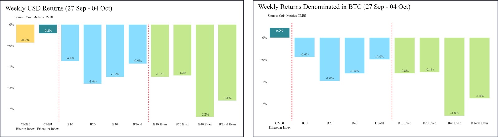 على الرغم من تأثر العملات المشفرة الرئيسية نظرًا لارتباطها ، إلا أن أصول Bletchley 10 الرقمية كانت الأقل تأثرًا بخسائر هذا الأسبوع. في حين أن الأصول الأكثر تضررا كانت من مؤشر Bletchley 20 الذي شهد خسارة 1.4٪. بعد أصول B20 ، كانت أصول B40 تسجل انخفاضًا في قيمتها بنسبة 1.2٪.