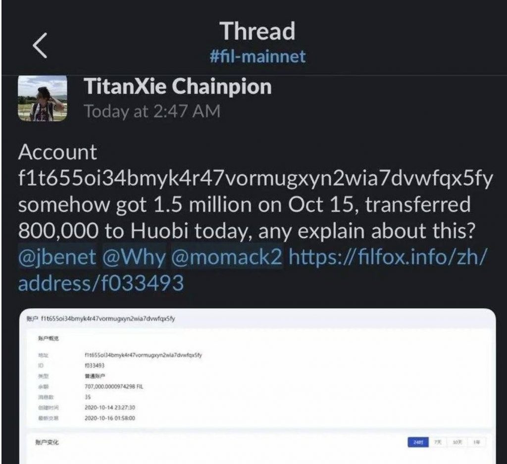 دعم Justin Sun أيضًا ادعاءاته من خلال مشاركة لقطة شاشة لحساب مؤسس Filecoin تعكس تلقي المؤسس 1.5 مليون FIL في 15 أكتوبر ، وهو نفس اليوم الذي تم فيه إطلاق Filecoin.