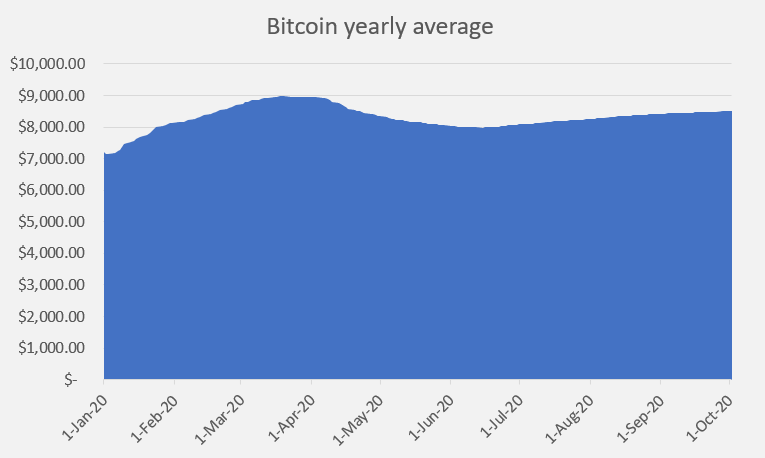 في المتوسط السنوي ، تفوق الذهب بوضوح على عملة البيتكوين ، نظرًا لاستقرار المعدن الأصفر مقترنًا بالاندفاع في الربع الثاني من العام حيث بدأت الدول في طرح حزم التحفيز الاقتصادي. ها هو الرسم البياني الذي ينظر إلى المتوسط السنوي لعملة البيتكوين والذهب ، ومن الواضح أن هناك فائزًا واحدًا فقط.