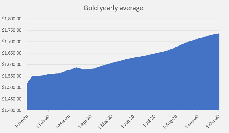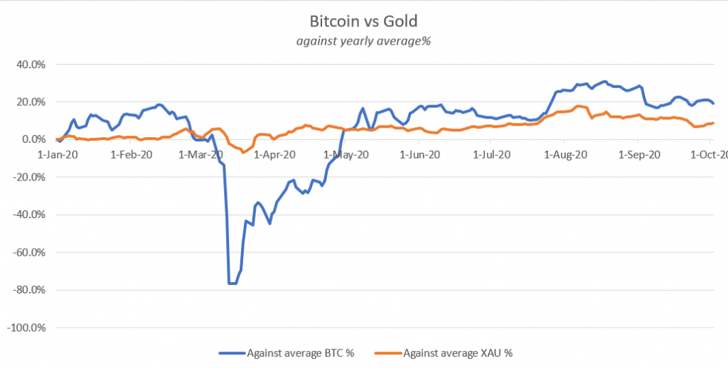 بدأ الذهب العام عند 1521 دولارًا ، وهو الآن أعلى بقليل من 1900 دولار ، بمتوسط سنوي قدره 1735 دولارًا ، في نهاية سبتمبر ، وهو ما يمثل قفزة بنسبة 14.5 في المائة مقابل المتوسط. من ناحية أخرى ، بدأت عملة البيتكوين العام عند 7200 دولار ، وهي الآن تبلغ 11300 دولار ، بمتوسط سنوي قدره 8.500 دولار ، في نهاية سبتمبر ، قفزة بنسبة 18.2 في المائة.
