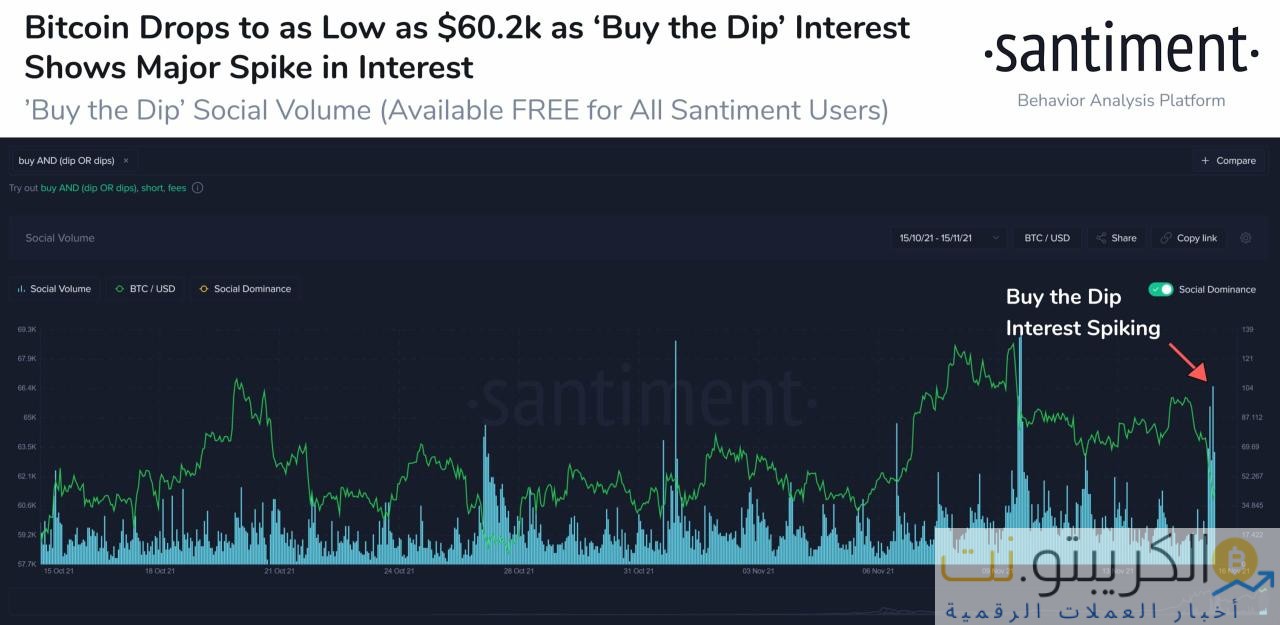 فيما يتعلق بالأحجام الاجتماعية ، يبدي المستثمرون اهتمامًا بالاستفادة القصوى من انخفاض الأسعار. في الواقع ، ارتفعت نسبة الفائدة على “شراء الانخفاض” مؤخرًا.
