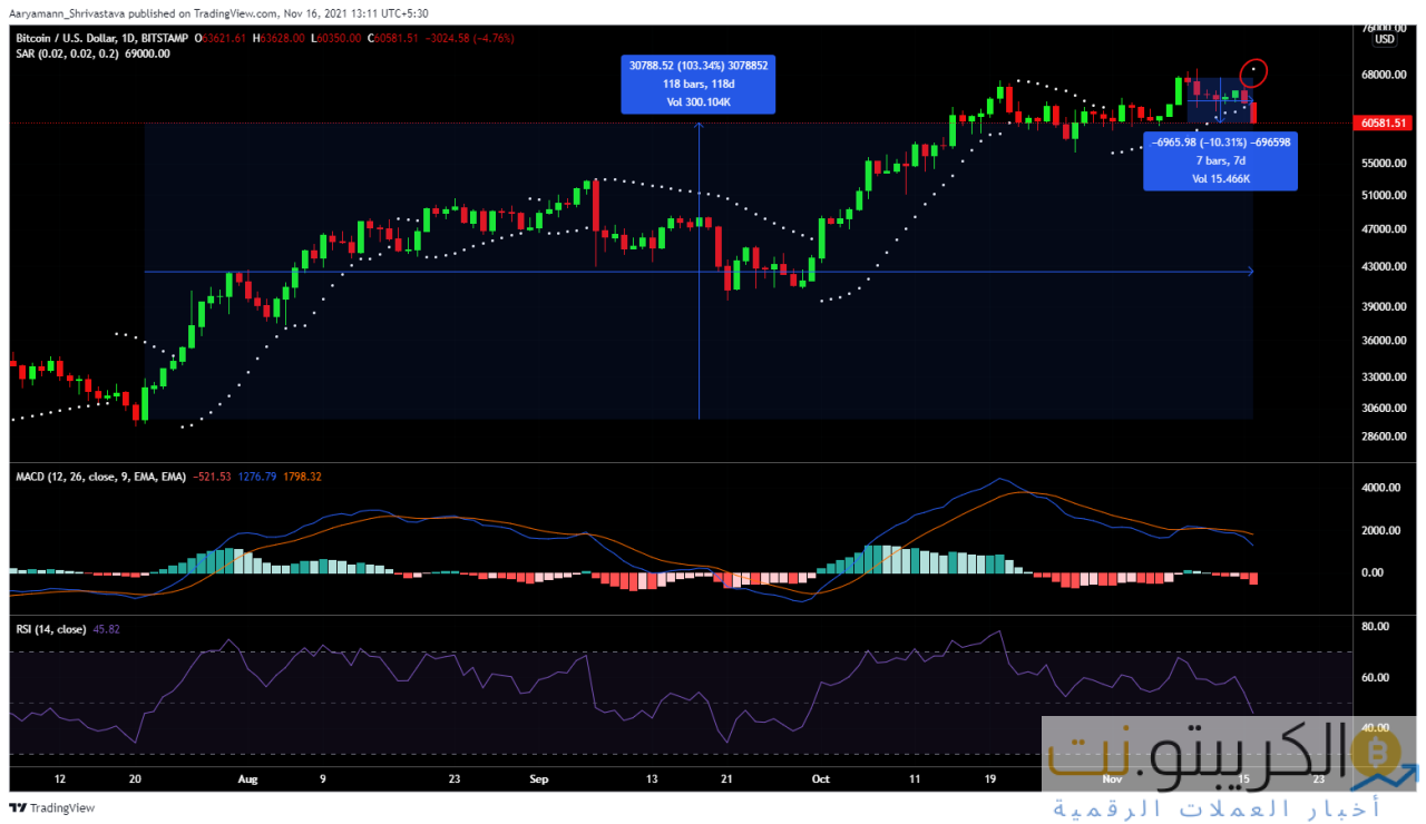منذ ذلك الحين ، ومع ذلك ، كان السعر ينخفض ​​باستمرار ، مع انخفاض بنسبة 7 ٪ خلال الـ 24 ساعة الماضية. كان هذا هو حجم الاستهلاك الذي انخفض فيه البيتكوين نحو مستوى 60 ألف دولار الآن.