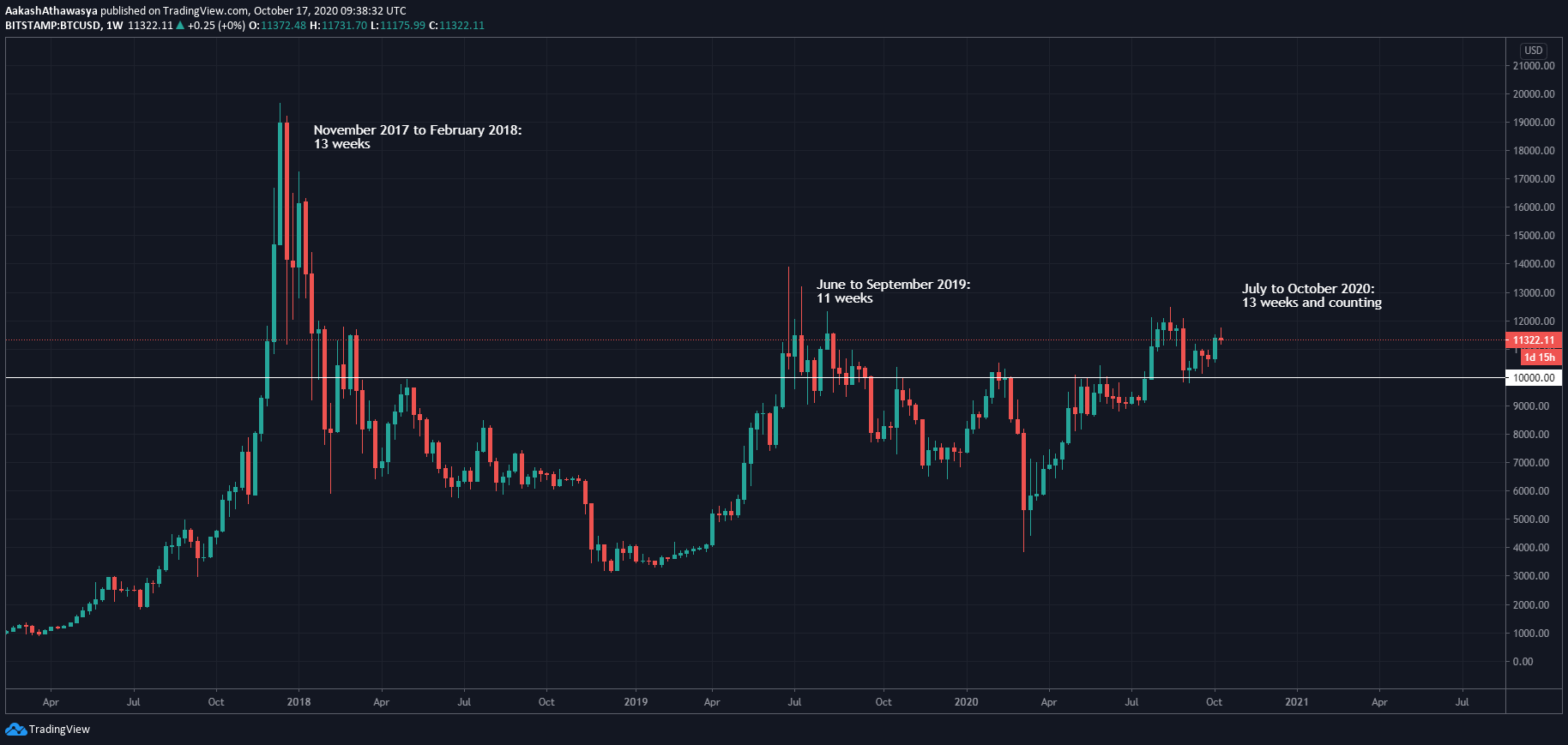نظرًا لأن Bitcoin أمضت 12 أسبوعًا منذ الأسبوع قبل الأخير من شهر يوليو في التداول بأكثر من 10000 دولار ، فقد أصبح الآن على بعد أسبوع فقط من تجاوز إنجاز ديسمبر 2017 ، وهو أمر ليس بالأمر الهين.