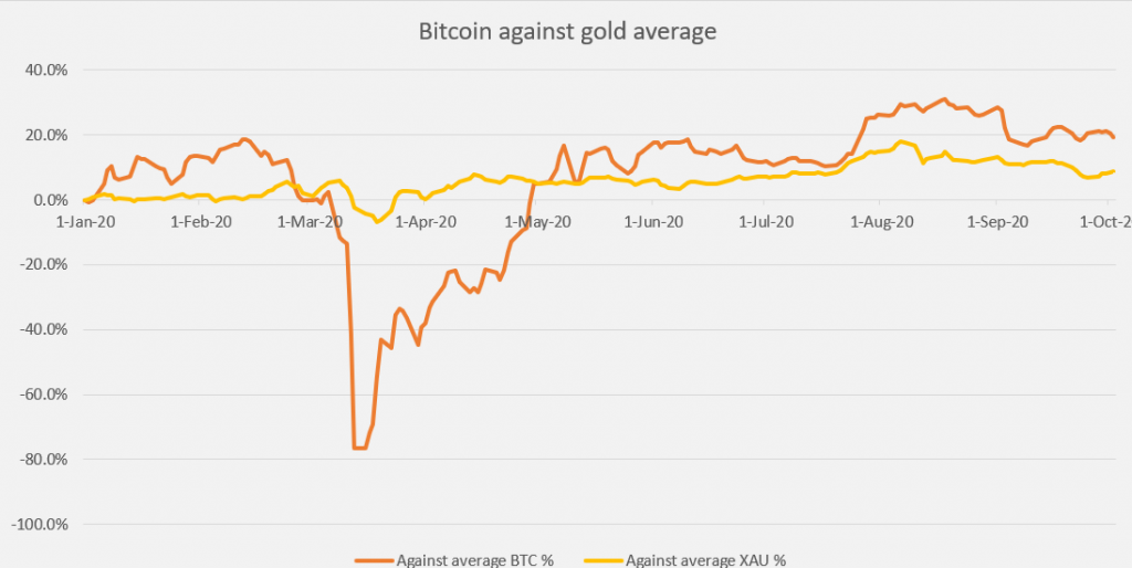 في 4 مايو ، ولأول مرة منذ أكثر من شهرين ، تجاوز سعر البيتكوين المتوسط ​​المتحرك السنوي سعر الذهب. بلغ هذا الاختلاف ذروته في أغسطس عندما كانت عملة البيتكوين أعلى بنسبة 31 في المائة من المتوسط ​​المتحرك السنوي ، بينما كان الذهب أعلى بنسبة 11.4 في المائة فقط. كان هذا يعني أنه في حين ارتفع الذهب إلى أعلى مستوى في سبع سنوات وارتفع بمقدار ثلث سعره في أغسطس ، إلا أن انتعاشه كملاذ آمن لا يزال ضئيلًا مقارنةً بعملة البيتكوين ، لا سيما بالنظر إلى حقيقة أن العملة المشفرة شهدت انهيارًا يوميًا بنسبة 25 بالمائة في مارس. ، بينما شهدت السلعة انهيارًا بنسبة 4.1 بالمائة فقط.