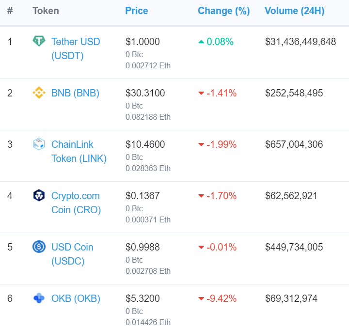 كان رمز OKB الخاص بـ OKEx في المركز السادس ، ومع ذلك ، نظرًا لإيقاف OKEx لعمليات السحب لجميع العملات المشفرة ، كانت العملة تشهد عيبًا.