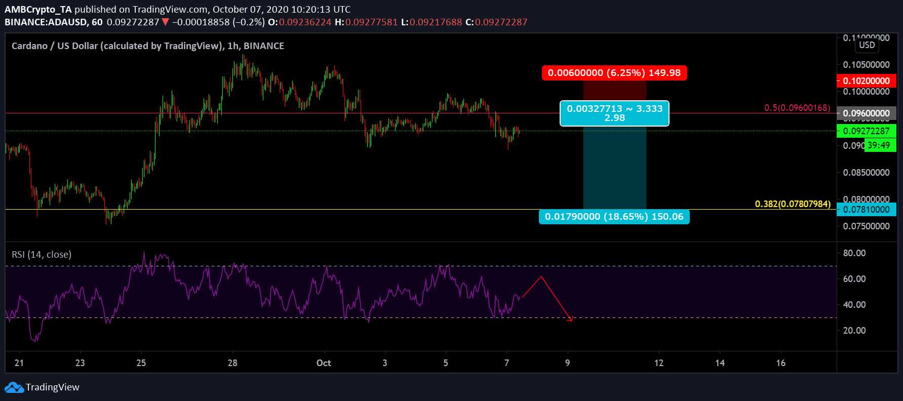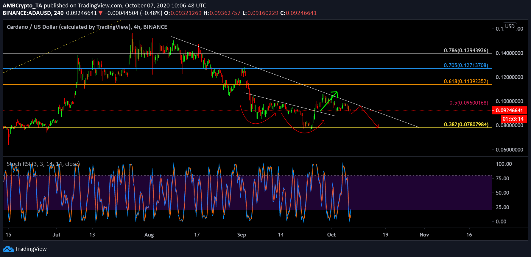 حدد الرسم البياني لـ4 ساعات لكاردانو بوضوح الاتجاه الهبوطي طويل المدى الذي يتبعه ADA منذ بداية أغسطس. خلال الاتجاه الهبوطي على مدى الشهرين الماضيين ، شوهدت ارتفاعات منخفضة قليلة بينما حدث آخرها خلال ارتفاع الأسعار بعد انهيار 23 سبتمبر.