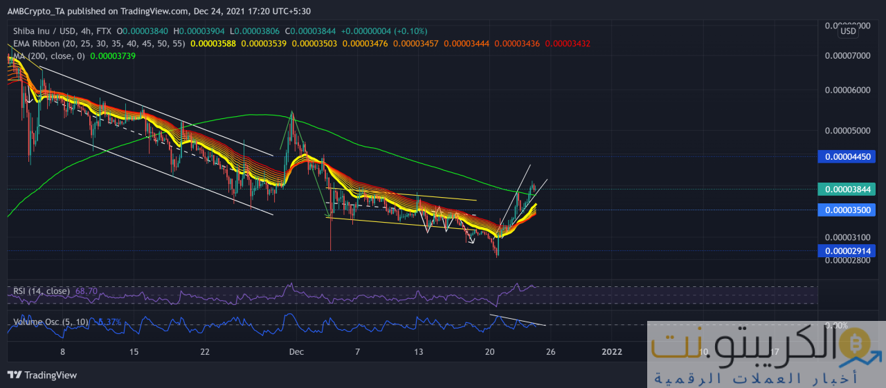 في وقت كتابة هذا التقرير ، تم تداول سهم SHIB بسعر 0.00003844 دولار. ال RSI تمايل بالقرب من منطقة ذروة الشراء وفضل بشكل واضح الثيران. أيضا ، شرائط EMA انقلبت بعد فترة طويلة لإظهار ميزة صعودية. ومع ذلك ، تميزت القمم المنخفضة في مذبذب الحجم أشار إلى أن المشترين ما زالوا غير في السيطرة الكاملة.