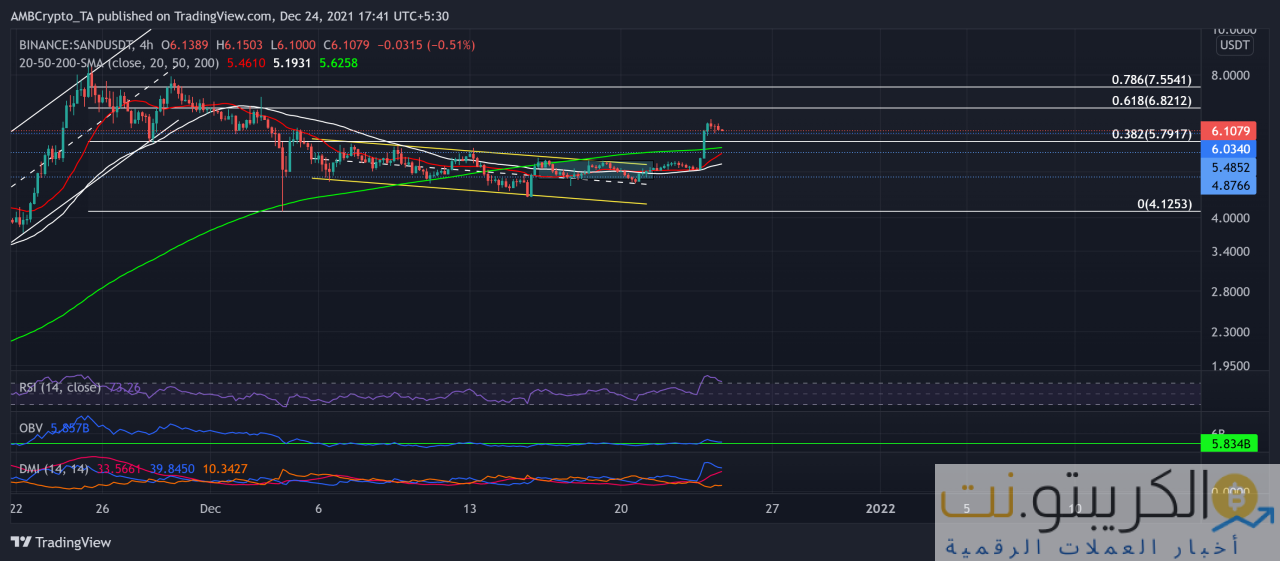 مثل SHIB ، سجلت SAND مكاسب بنسبة 34.39٪ من أدنى مستوى لها في 20 ديسمبر. أي انهيار من هنا سيشهد اختبار الدعم بالقرب من 20-SMA (الأحمر) عند المستوى 5.4 دولار