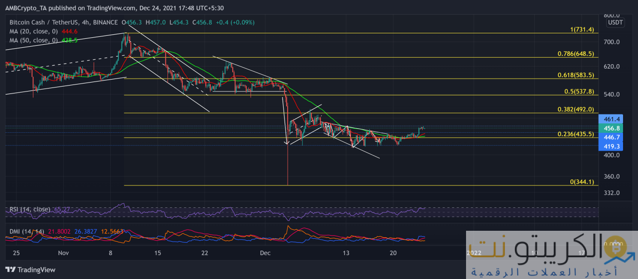شهد البديل نسبة 9.07٪ من 20 ديسمبر ولكنه شهد تراجعا عن المقاومة على المدى القريب عند علامة 461 دولار. الآن ، وجدت BCH دعمًا بالقرب من 20 (أحمر) و 50 (أخضر) SMA.