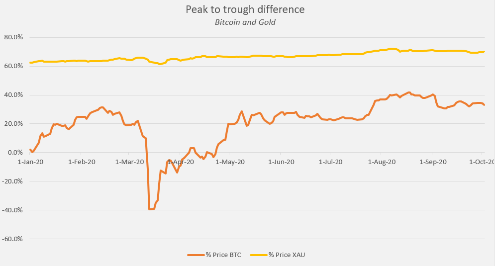 في حين أن انحراف البيتكوين كان أعلى بكثير من الذهب ، كانت الارتفاعات والانخفاضات في العملات المشفرة مبعثرة ، وخاصة الارتفاعات. كسر 10000 دولار في مناسبتين قبل انخفاضه في مارس وارتفع باطراد منذ ذلك الحين يعني أن PTT كان ممثلاً إلى حد ما لسعره ، على عكس الذهب الذي كان ضالًا مقارنة بسعره الأكثر استقرارًا على مدار العام ، إذا تركت الارتفاعات والانخفاضات جانبًا.