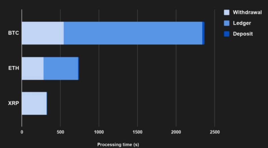 من خلال تقديم حالة لنفسها مرة أخرى ، كعملة جسر ، يوضح الرسم البياني أعلاه وقت المعاملة المنخفض لـ XRP لتحويل الأصول بما يعادل 10000 دولار أمريكي في BTC و ETH و XRP من Binance إلى Coinbase.