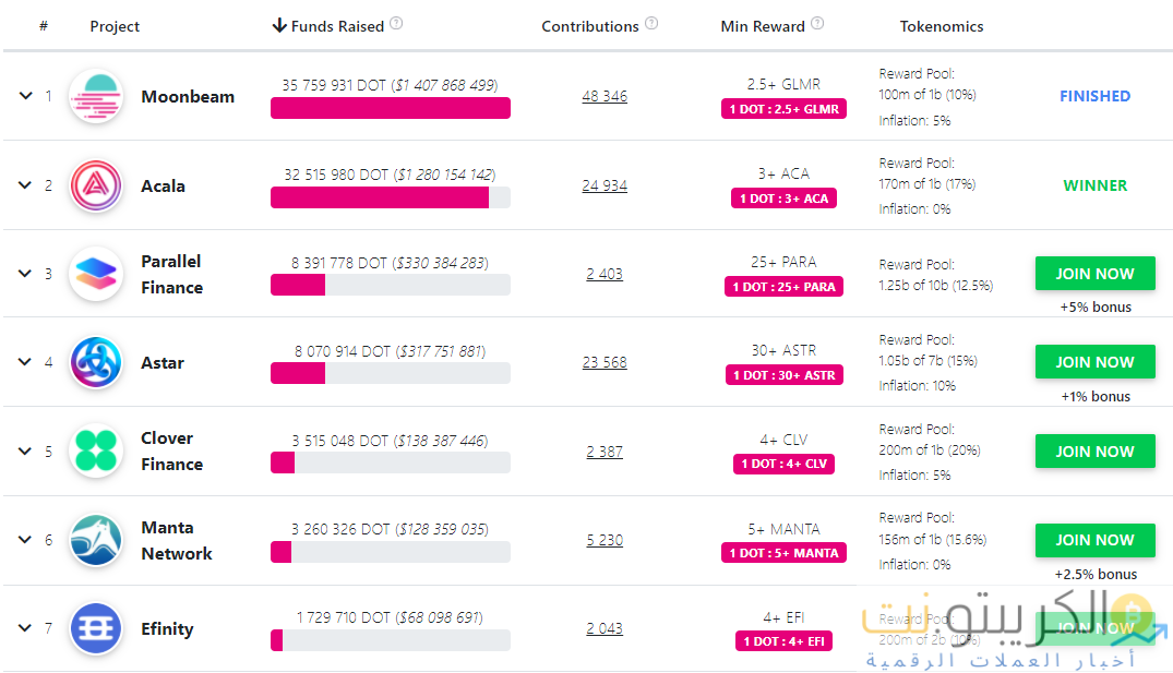 جمعت Efinity حاليًا 1.7 مليون DOT بقيمة 68 مليون دولار. علاوة على ذلك ، فقد احتلت حاليًا المركز السابع في المنافسة مع Manta و Clover Finance و Astar و Parallel Finance.