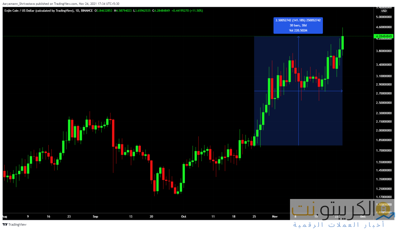 الآن ، استفاد من هذا في الواقع Enjin ومستثمروها. خاصة وأن العملة البديلة قد قفزت مرتين في الشهر الماضي ، مسجلة ارتفاعًا بنسبة 141٪.