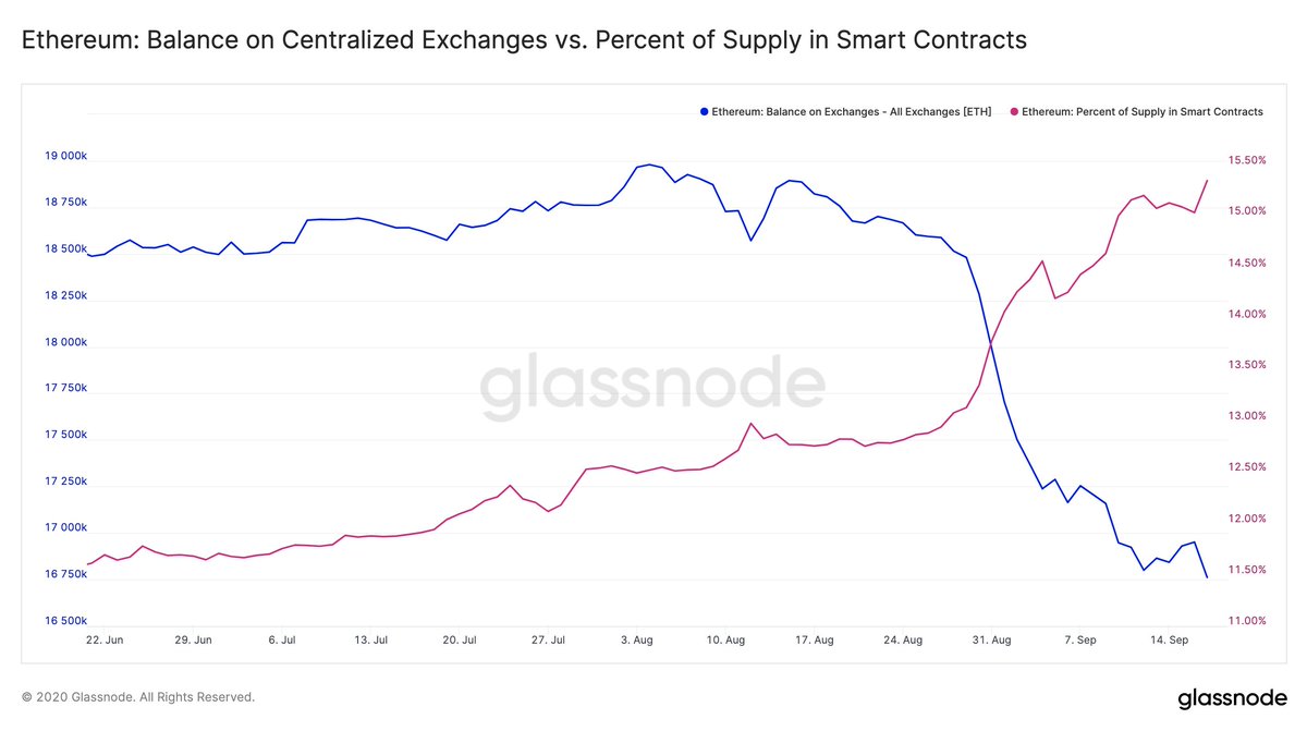 بالإضافة إلى ذلك ، عانت ETH المحتفظ بها في البورصات من مصير مماثل من الانخفاض. انخفض سعر الصرف الذي يحتفظ به ETH من 19 ألفًا إلى 16 ألفًا منذ أغسطس. هذا ليس جانبًا مثيرًا للاهتمام ولكن ETH المحتفظ به في العقود الذكية قد شهد زيادة بينما انخفض رصيد الصرف الخاص بـ ETH.