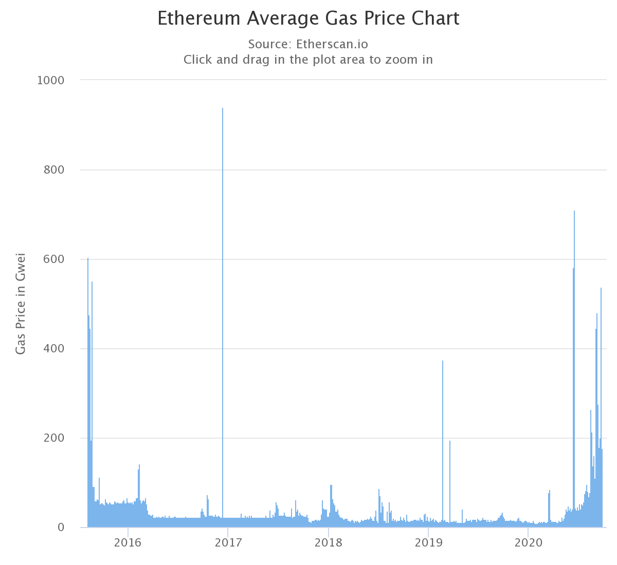 يظهر الرسم البياني ارتفاعًا حادًا في رسوم الغاز مع اندفاع الناس نحو زراعة المحاصيل. في وقت من الأوقات ، كانت رسوم الغاز تصل إلى 500 جيجا. يبدو أن أسعار الغاز ترتفع ثم تعود إلى وضعها الطبيعي ، حتى كتابة هذه السطور ، انخفضت رسوم الغاز إلى 176 gwei ، وهي أعلى قليلاً من المستويات المعتادة.