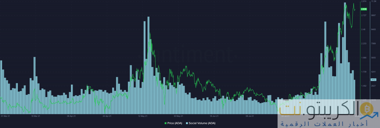 كان الاتجاه الهبوطي في الأحجام الاجتماعية منذ 24 أغسطس مؤشرًا أيضًا على انخفاض الجاذبية الاجتماعية. ومع ذلك ، تميل البدائل إلى الارتفاع بشكل أفضل عندما يكون لديهم اهتمام أقل ، وهو ما كان لصالح سعر ADA. بالإضافة إلى ذلك ، شهد تقييم ADA على مخطط ADA / BTC نموًا جيدًا ، وهو ما كان علامة جيدة على حركة السعر.