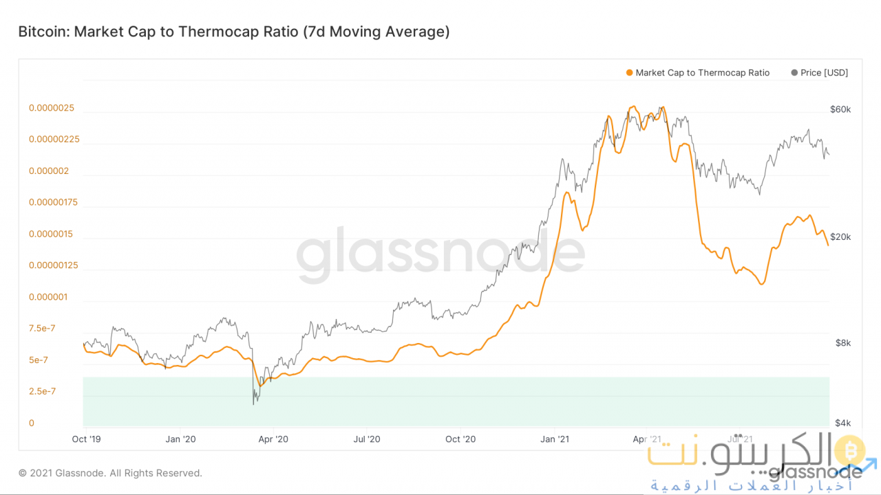 ومع ذلك ، كان أحد الاتجاهات المقلقة هو الانخفاض الملحوظ في Market Cap to Thermocap Ratio. النسبة هي أساسًا القيمة السوقية مقسومة على Thermocap وتستخدم لتقييم ما إذا كان سعر الأصل يتم تداوله حاليًا بعلاوة فيما يتعلق بإجمالي الإنفاق الأمني من قبل المعدنين. يتم تعديل النسبة لمراعاة زيادة العرض المتداول بمرور الوقت.