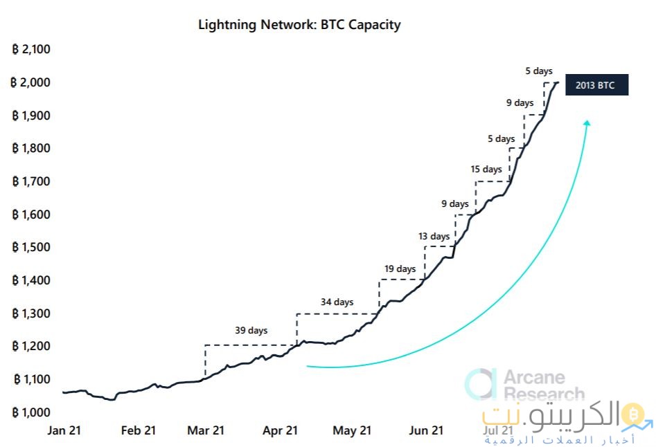 في الوقت الحالي ، إذا كان Lightning قادرًا على الحفاظ على نفس معدل النمو ، فسوف يتجاوز حل L2 التحجيم سعة 10000 BTC بحلول مارس 2022.