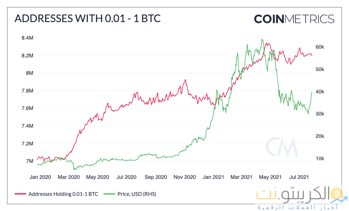 كان هناك 8.17 مليون عنوان يحمل 0.01-1 BTC في 11 مايو. ومع ذلك ، في 28 يوليو ، كان هناك 8.25 مليون عنوان تحتوي على 0.01-1 BTC.