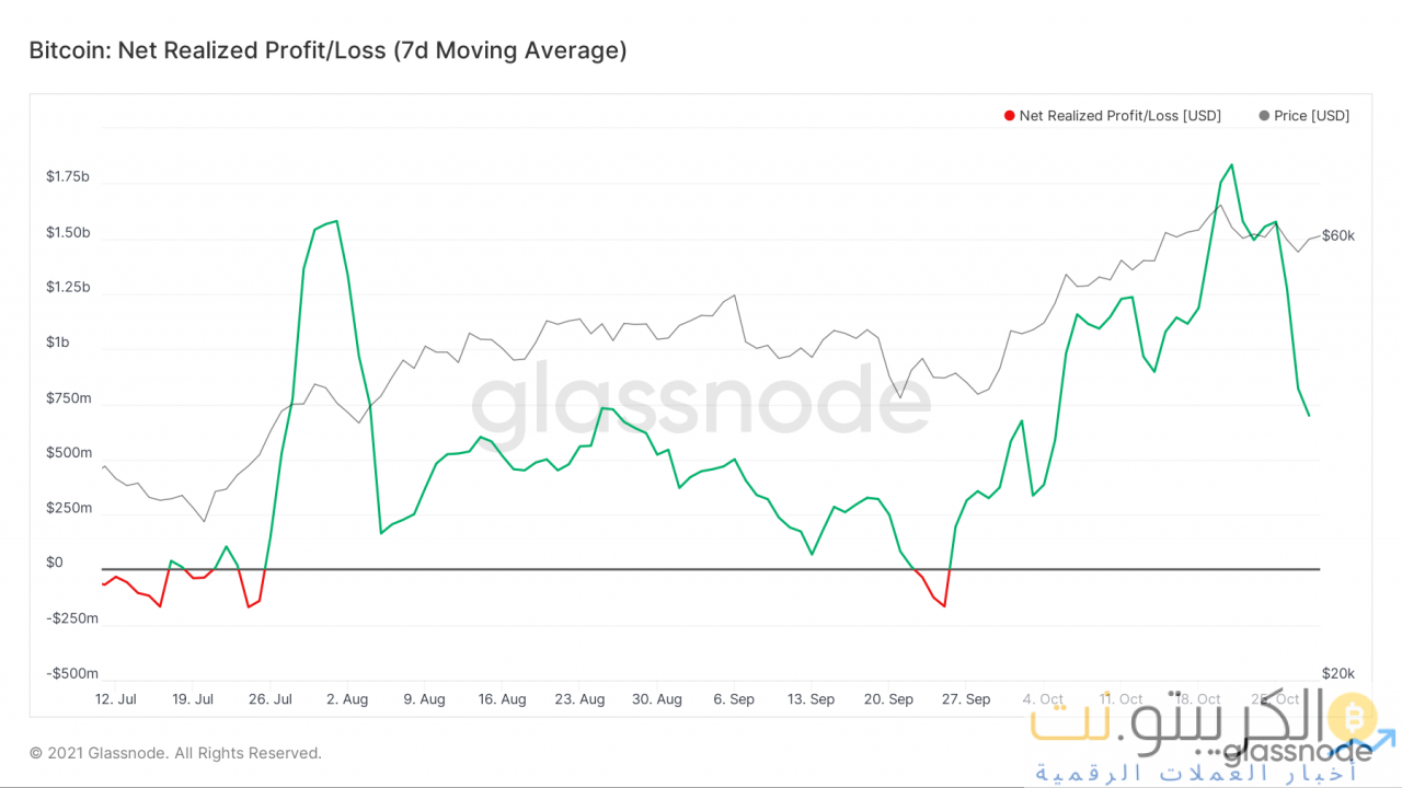 الأول هو أن كبار المشترين قد يتكبدون خسائر. أدى التوحيد والتصحيح إلى فشل بعض الاستثمارات في تحقيق الأرباح ويمكن استخلاص نفس الاستدلال بناءً على البيانات الموجودة على السلسلة. يوضح الرسم البياني للأرباح / الخسائر المحققة أنه في الأسبوع الماضي ، لاحظت BTC في العرض انخفاضًا في الأرباح مما يؤدي بدوره إلى خسائر للمستثمرين.