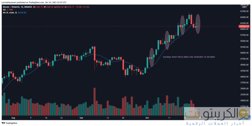 بعد إنشاء مستوى مرتفع جديد قدره 67 ألف دولار في 20 أكتوبر ، كان سعر البيتكوين يدور بشكل أو بآخر في نطاق 60 ألف دولار إلى 63 ألف دولار. من الواضح أن جلسات التداول القليلة الماضية كانت رتيبة وارتفعت قيمة العملة المعدنية بنسبة 0.11٪ خلال الـ 24 ساعة الماضية.