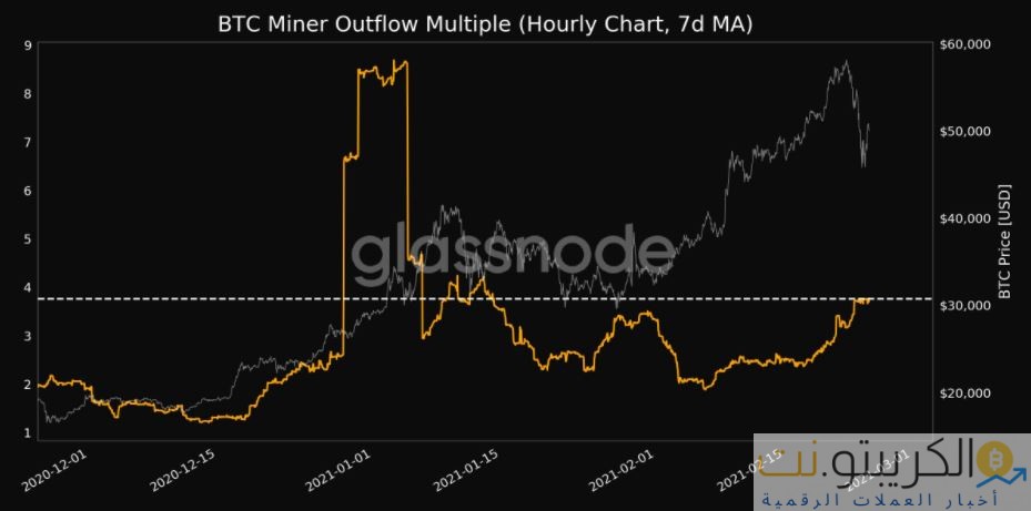 وفقًا لـ Glassnode البيانات، ارتفع Bitcoin Miner Outflow Multiple ليصل إلى أعلى مستوى شهري بعد انخفاض BTC على المخططات المقياس المذكور أعلاه يتعلق بالفترة الزمنية التي تكون فيها كمية البيتكوين المتدفقة من عناوين المعدنين أعلى من المتوسط التاريخي.