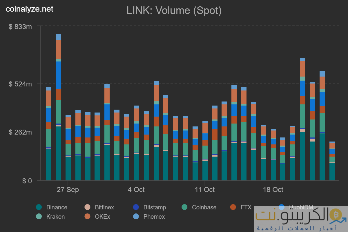في غضون 5 أيام فقط ، ارتفع سعر LINK بنسبة 22٪. بسبب هذا البيع والشراء ، شهد السوق طفرة وتم شراء وبيع أكثر من 25.7 مليون لينك بقيمة تزيد عن 7.7 مليار دولار. في وقت لاحق ، شهدت أحجام التداول في السوق الفورية أيضًا ارتفاعًا ولمدة 3 أيام ، بقيت أعلى من 500 مليون دولار.