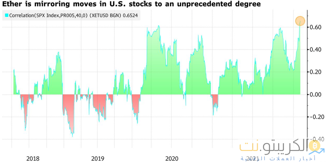 شهدت البيتكوين، أكبر تشفير مسار مماثل. وقد سجل ارتباطها بالأسهم رقما قياسيا في الأيام الأخيرة. وبالتالي، فإن الإيحاء بأن الأصول الرقمية يمكن أن ترتفع جنبا إلى جنب مع أي ارتفاع في الأسهم.
