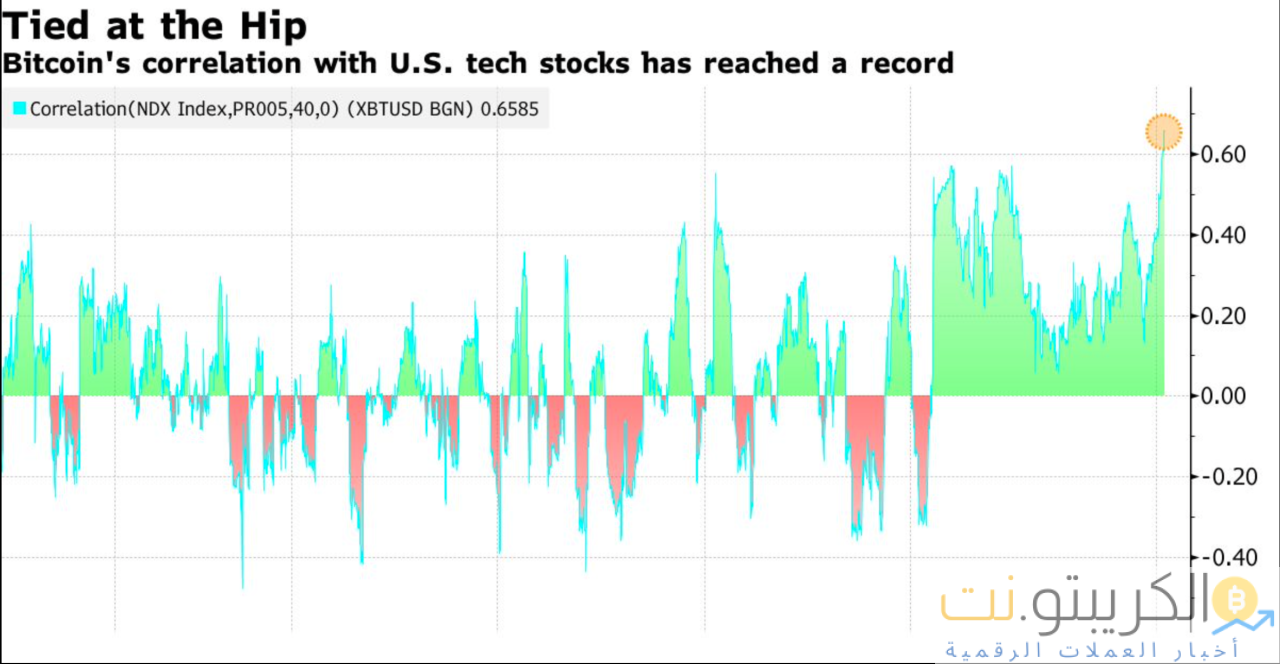 “بلغ معامل الارتباط لمدة 40 يوما للرمز الرقمي ومؤشر ناسداك 100 الثقيل التقني ما يقرب من 0.66 – وهو أكبر معدل في البيانات التي جمعتها بلومبرج منذ عام 2010 – في حين أن ارتباطا مماثلا مع مؤشر S&amp.P 500 سجل أيضا”.
