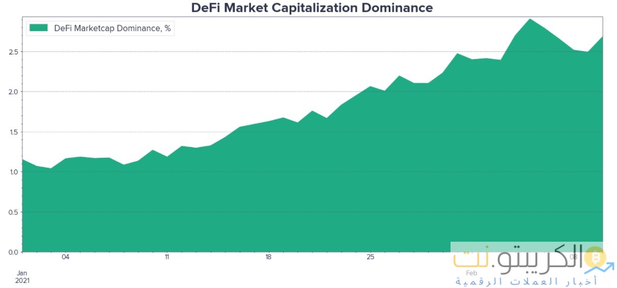 دعنا ننظر إلى DeFi إذن ، ولنبدأ بالأبسط – Market Cap. وفقًا لـ Santiment ، منذ بداية عام 2021 ، ارتفعت هيمنة القيمة السوقية لجميع عملات DeFi إلى 2.7٪ من 1.2٪. ما هو أكثر من ذلك ، “رقائق DeFi الزرقاء مثل UNI و AAVE – العملات المعدنية التي لم تكن موجودة قبل عام – أصبحت الآن بشكل مريح من بين أكبر 20 عملة معدنية من حيث القيمة السوقية.”