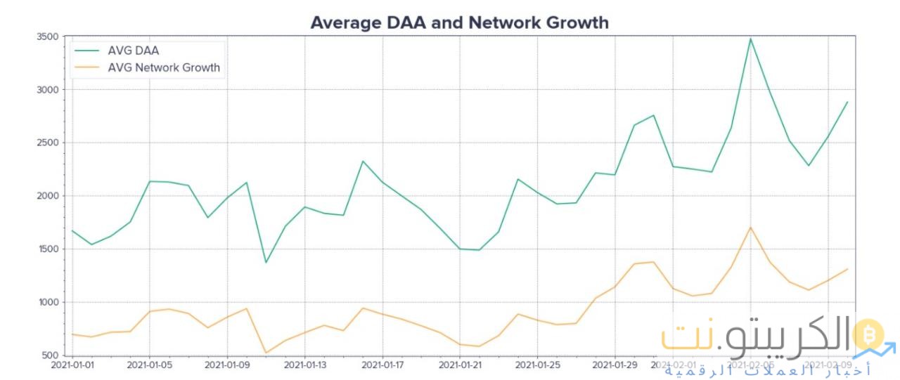 كان التحسن المذكور واضحًا على مخطط نمو شبكة عملات DeFi أيضًا ، مع ارتفاع متوسطات كل من DAA ونمو الشبكة منذ يناير 2021 ، مع بلوغ الذروة في الخامس من فبراير.