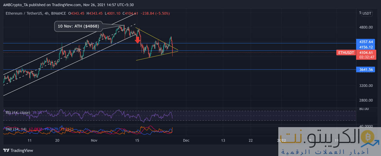 على الرغم من أن المضاربين على الارتفاع حاولوا مواجهة عمليات البيع ، إلا أنهم لم يتمكنوا من الحفاظ على مستوى 4156 دولارًا. في وقت النشر ، تم تداول البديل عند 4104.61 دولار أمريكي بعد خسارة 6.4٪ على مدار 24 ساعة. ال RSI كانت متجهة جنوبا وفضلت الدببة عند علامة 38. علاوة على ذلك ، فإن DMI أظهر تفضيلًا من جانب واحد للدببة. ومع ذلك ، أظهر مؤشر ADX اتجاه اتجاه ضعيف.