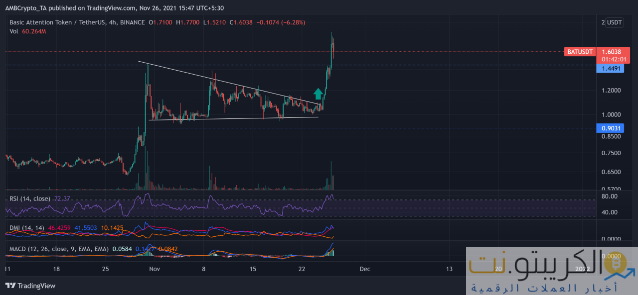 نتيجة لذلك ، لمست العملة البديلة ATH في 26 نوفمبر ، مدعومة بأحجام تداول عالية. في وقت كتابة هذا التقرير ، تم تداول BAT بسعر 1.54 دولار. ال RSI وقفت عند منطقة ذروة الشراء وأظهرت علامات تباطؤ. علاوة على ذلك ، DMI ود قراءات MACD يصور تفضيلًا للثيران لكنه ألمح إلى قوتهم المتناقصة.